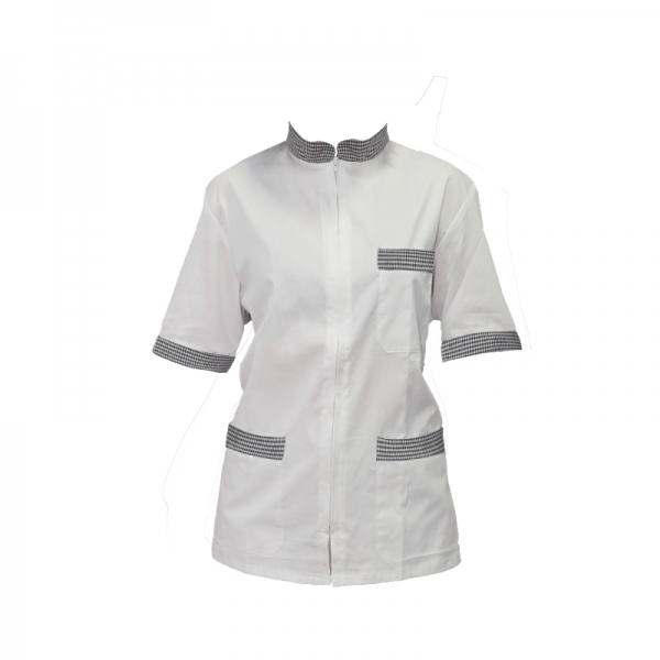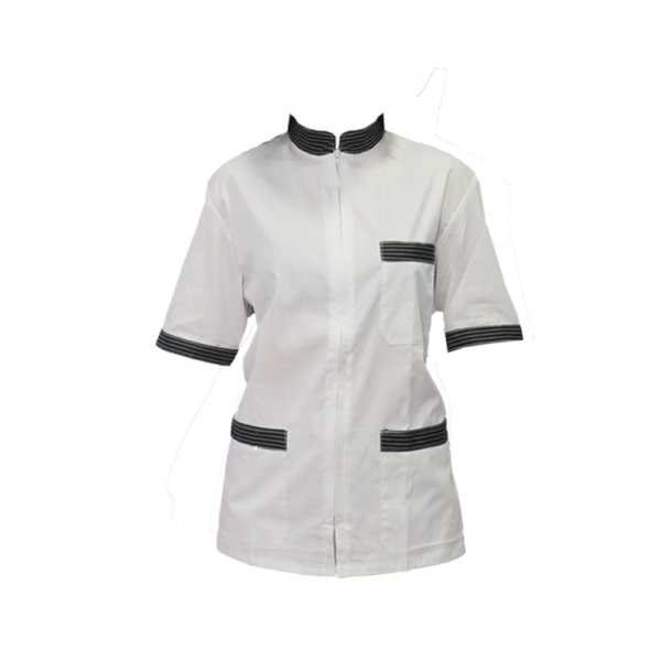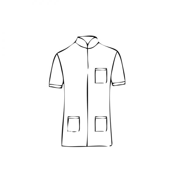 DETTAGLI - TASCHINO SUL PETTO - 2 TASCHE DAVANTI - COLLETTO CODA DI RONDINE - CHIUSURA NASCOSTA CON AUTOMATICI - POLSINI CON ELASTICO - MARTINGALA POSTERIORE TAGLIE XS-XXL TESSUTO 35% COTONE - 65% POLIESTERE 200 GR/MQ