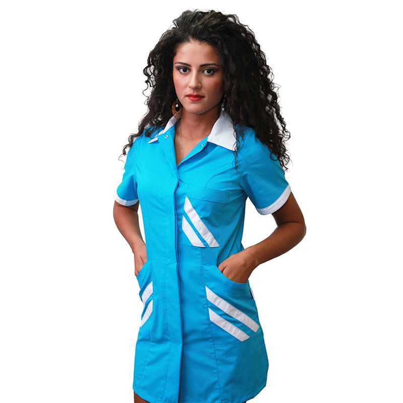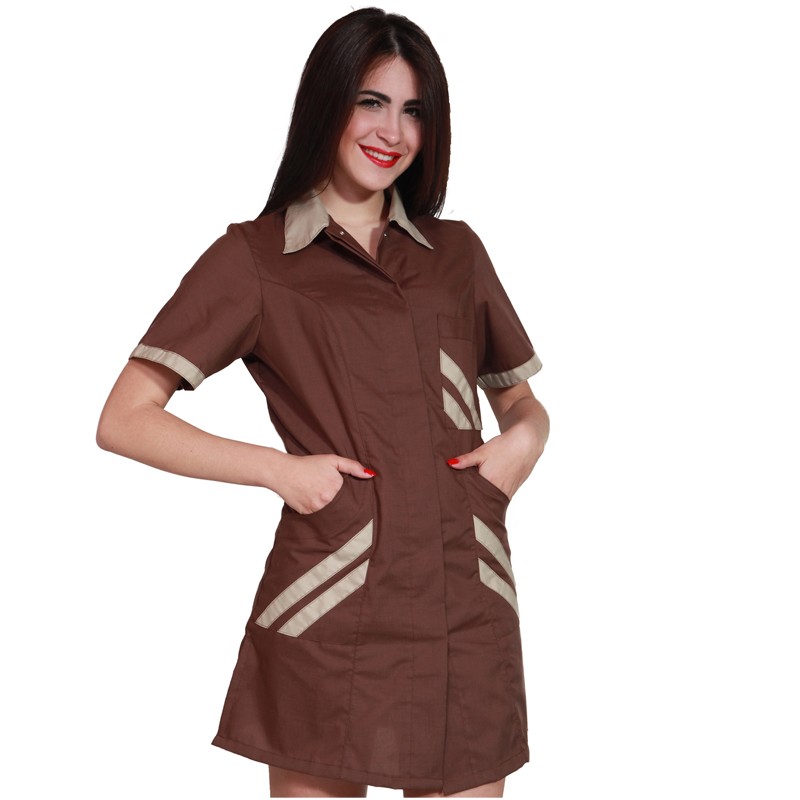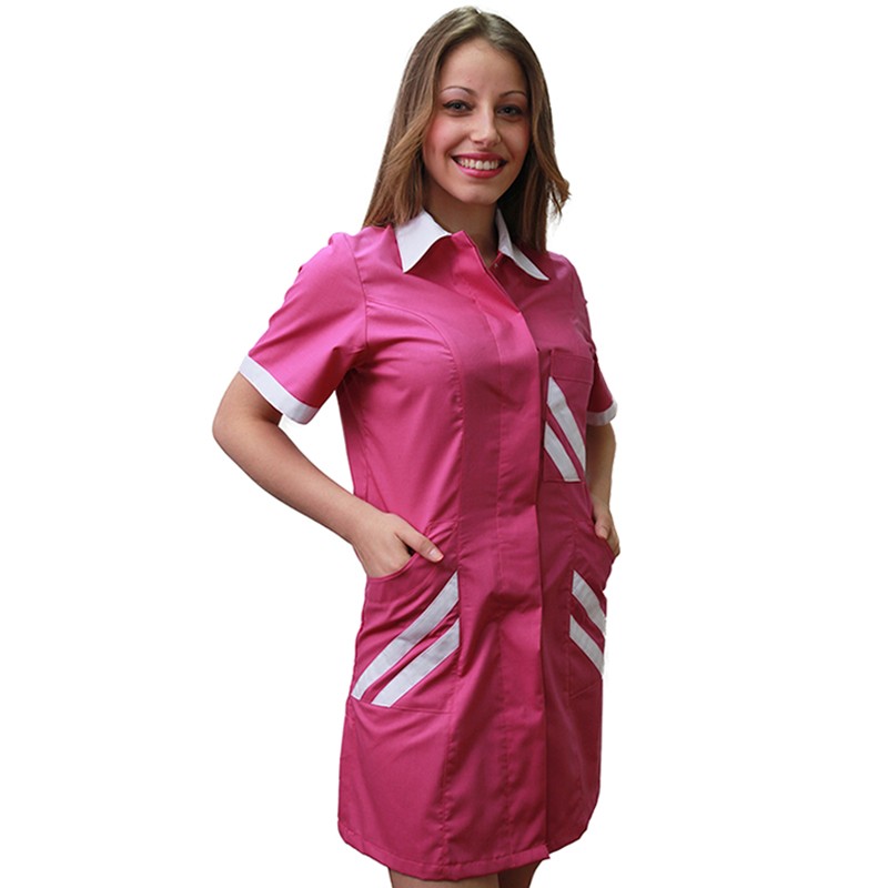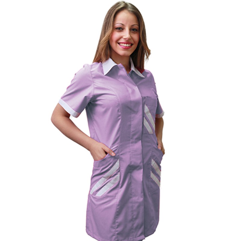 Taschino sul pettoDue tasche davantiColletto coda di rondineChiusura centrale con automatici coperti antipanicoPolsini con elasticoAntiacido TESSUTO100% cotone 200 gr/mq