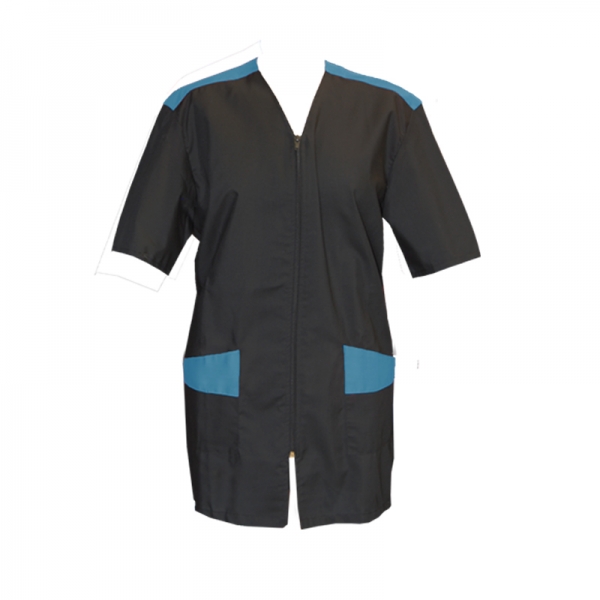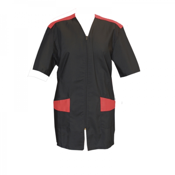 DETTAGLI - SCOLLO A V - CHIUSURA INCROCIATA - 2 TASCHE DAVANTI - COLLETTO CODA DI RONDINE - CHIUSURA CENTRALE BOTTONI IN ASOLA TAGLIE XS-XXL TESSUTO 35% COTONE - 65% POLIESTERE 200 GR/MQ