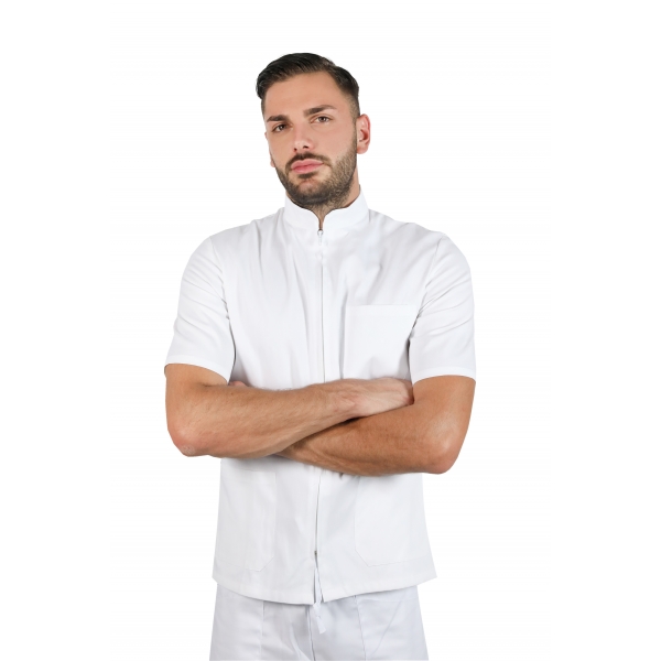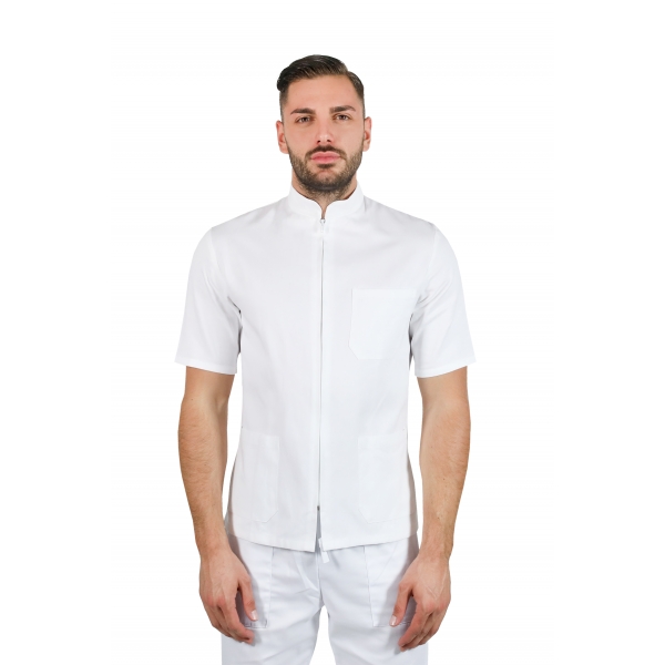 Dettagli Colletto coreana, chiusura laterale con bottoni clips, due tasche davantiTessuto35% Cotone - 65% Poliestere160 gr/mq
