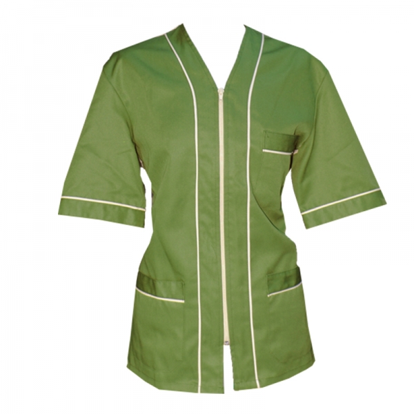 DETTAGLI - SCOLLO A V - CHIUSURA INCROCIATA - 2 TASCHE DAVANTI - COLLETTO CODA DI RONDINE - CHIUSURA CENTRALE BOTTONI IN ASOLA TAGLIE XS-XXL TESSUTO 35% COTONE - 65% POLIESTERE 200 GR/MQ