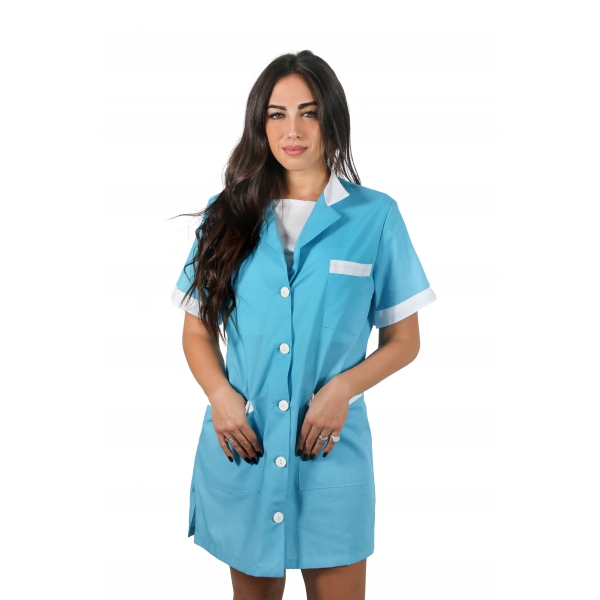 DETTAGLI - SCOLLO A V - CHIUSURA INCROCIATA - 2 TASCHE DAVANTI - COLLETTO CODA DI RONDINE - CHIUSURA CENTRALE BOTTONI IN ASOLA TAGLIE XS-XXL TESSUTO 35% COTONE - 65% POLIESTERE 200 GR/MQ