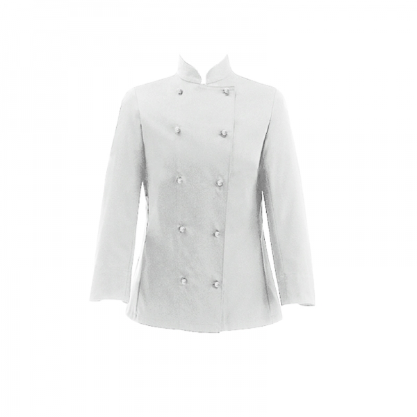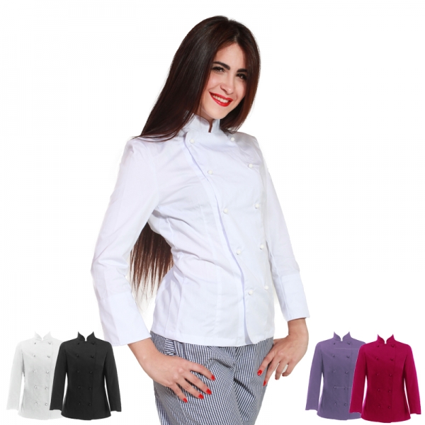 GIACCA CHEF Modello donna, sciancrata ai fianchi, finiture al colletto, finiture cuori, bottoni a funghetto, 100 % cotone, 160 gr/m2, taglie disponibili XS - XXL