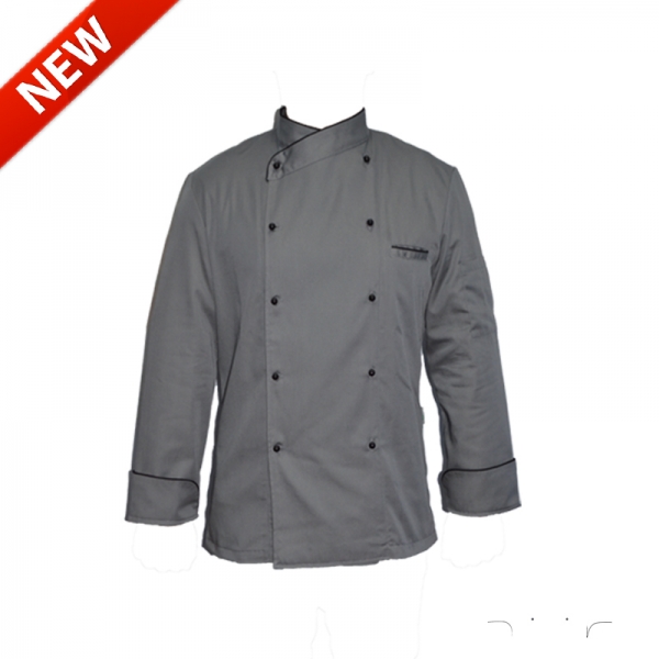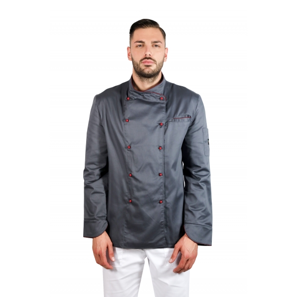 GIACCA CHEF Abbottonatura laterale, ricami sul colletto bottoni a funghetto in argento 65 % poliestere - 35% cotone - colore U02 nero, 200 gr/m2, taglie disponibili XS - XXXL