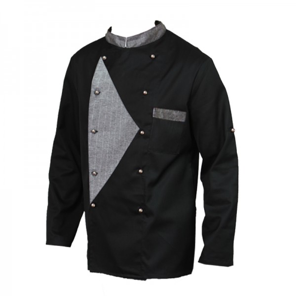 GIACCA CHEF Abbottonatura laterale, ricami sul colletto bottoni a funghetto in argento 65 % poliestere - 35% cotone - colore U02 nero, 200 gr/m2, taglie disponibili XS - XXXL