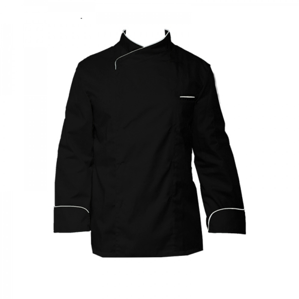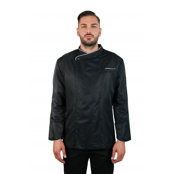 GIACCA CHEF Abbottonatura laterale, ricami sul colletto bottoni a funghetto in argento 65 % poliestere - 35% cotone - colore U02 nero, 200 gr/m2, taglie disponibili XS - XXXL