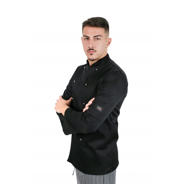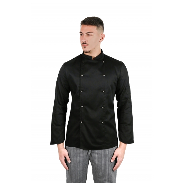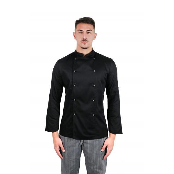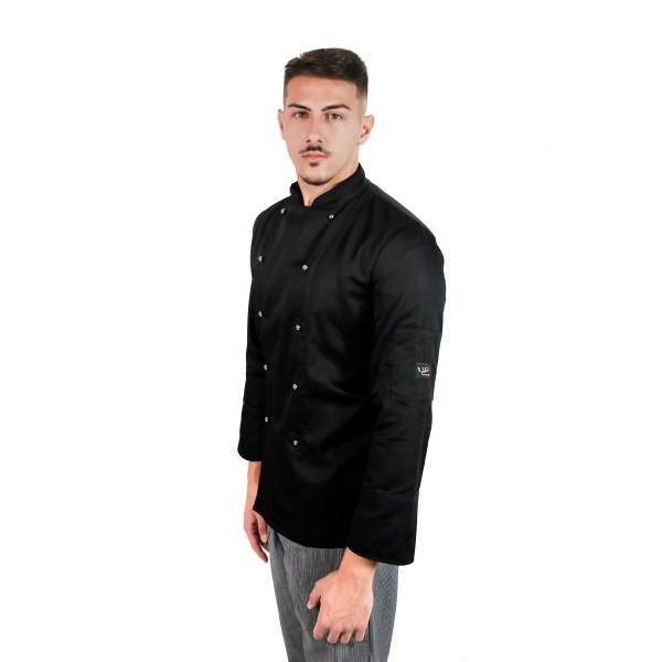 GIACCA CHEF Abbottonatura laterale, ricami sul colletto bottoni a funghetto in argento 65 % poliestere - 35% cotone - colore U02 nero, 200 gr/m2, taglie disponibili XS - XXXL