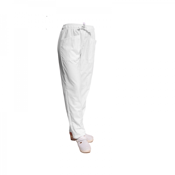 DETTAGLI Una tasca dietro, due tasche a filo fianchi, elastico e coulisse, elastico alle caviglie Colore bianco TESSUTO35% cotone - 65% poliestere 200 gr/mq