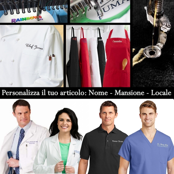 Si puo' personalizzare il capo con testo (nome, cognome, mansione, nome della struttura o azienda).